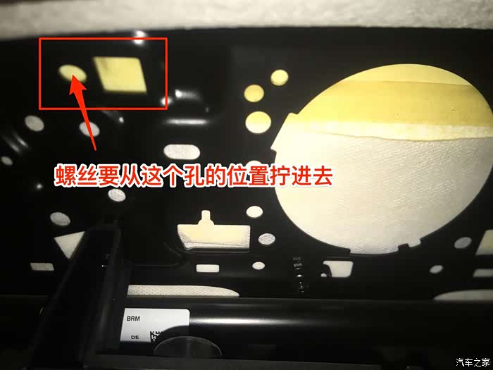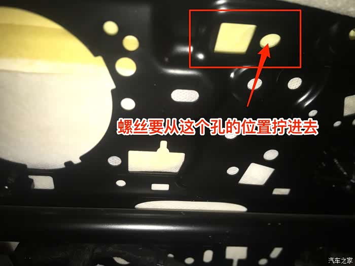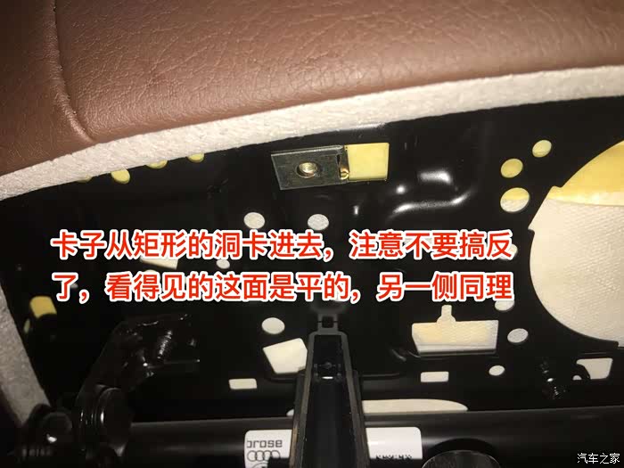 将座椅调到最高,趴下去看会看到左右两边各有一个方形的孔,方形孔旁边的圆孔就是用来固定抽屉的