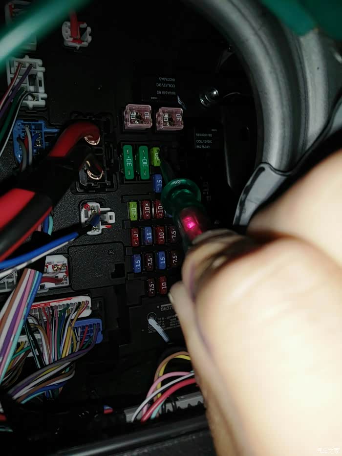 用12V的电笔先找原车常电,图片上电笔指的就是原车的常电(20A)
