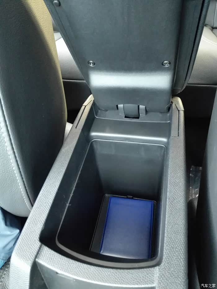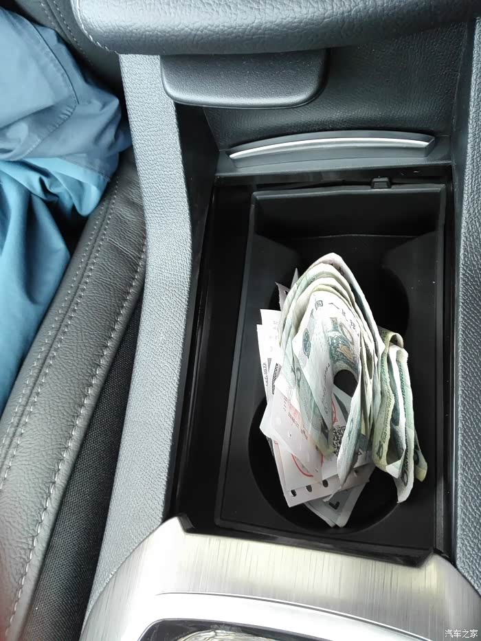 储物盒打开,其实是放水杯的水杯托,用来放零钱和票据