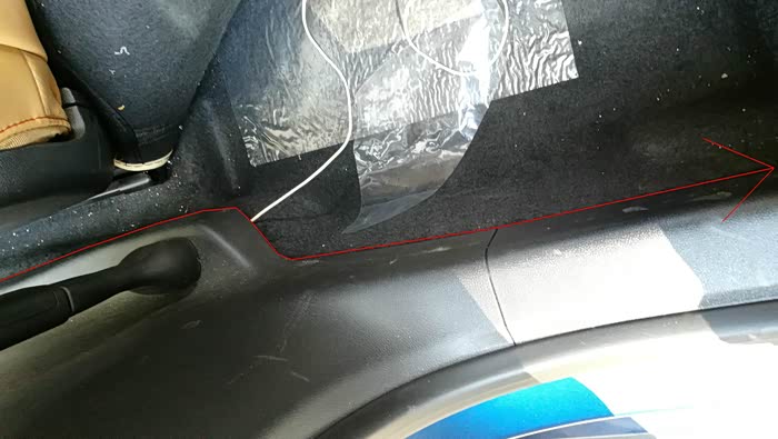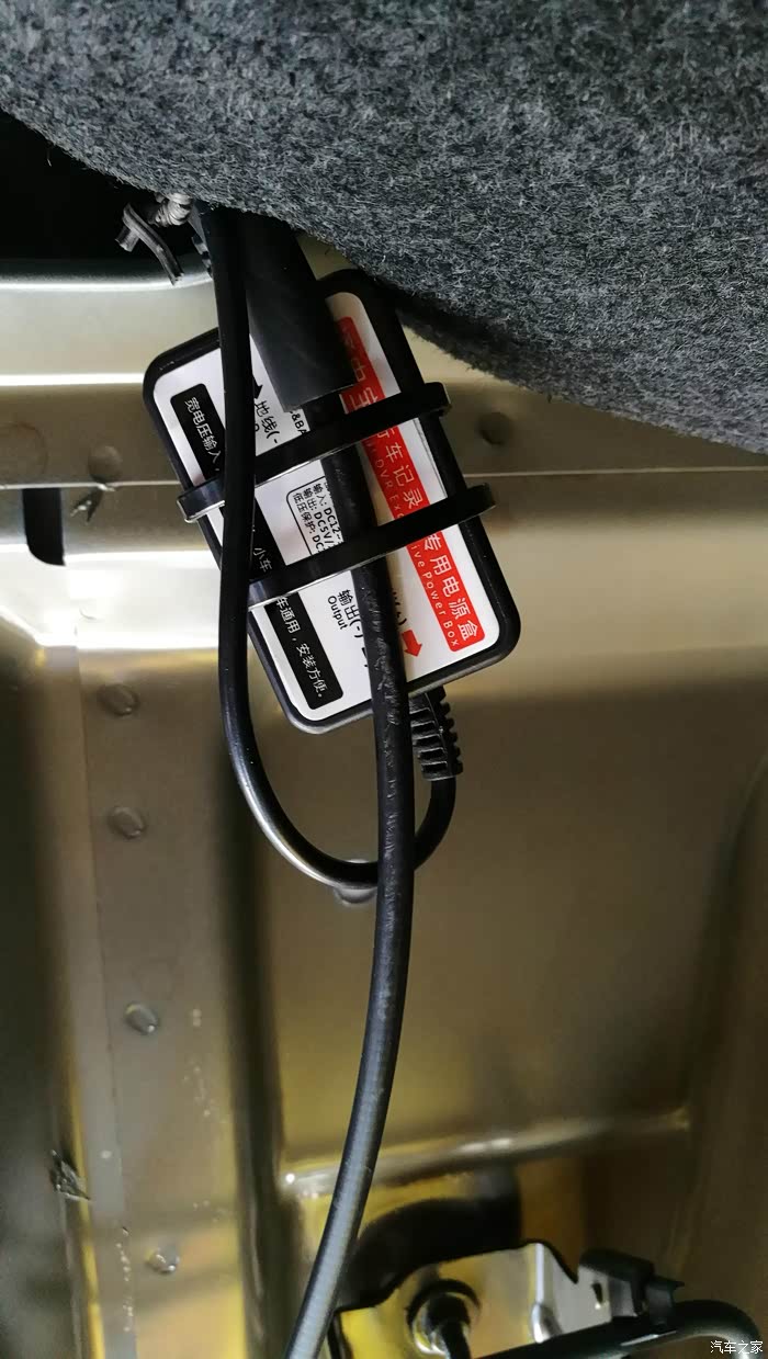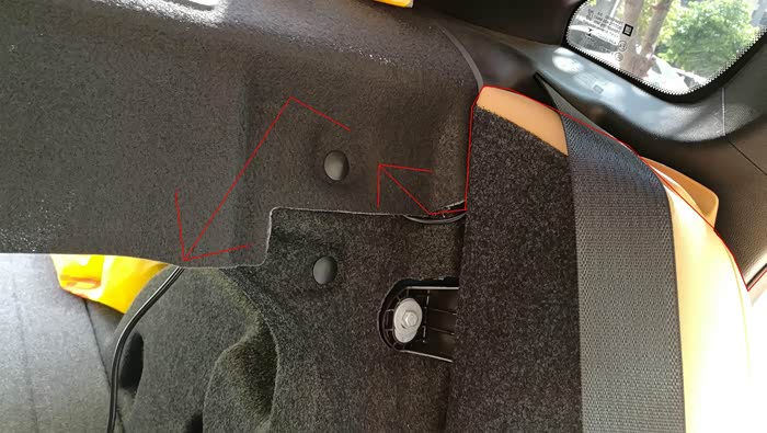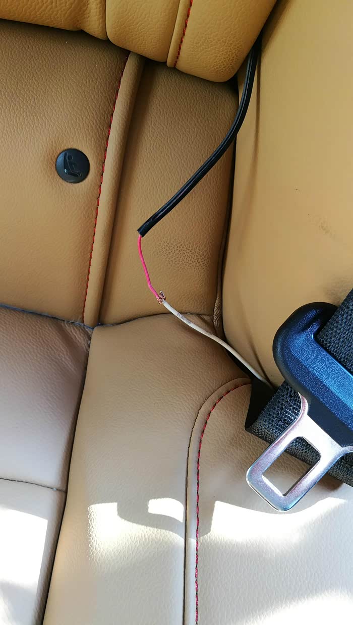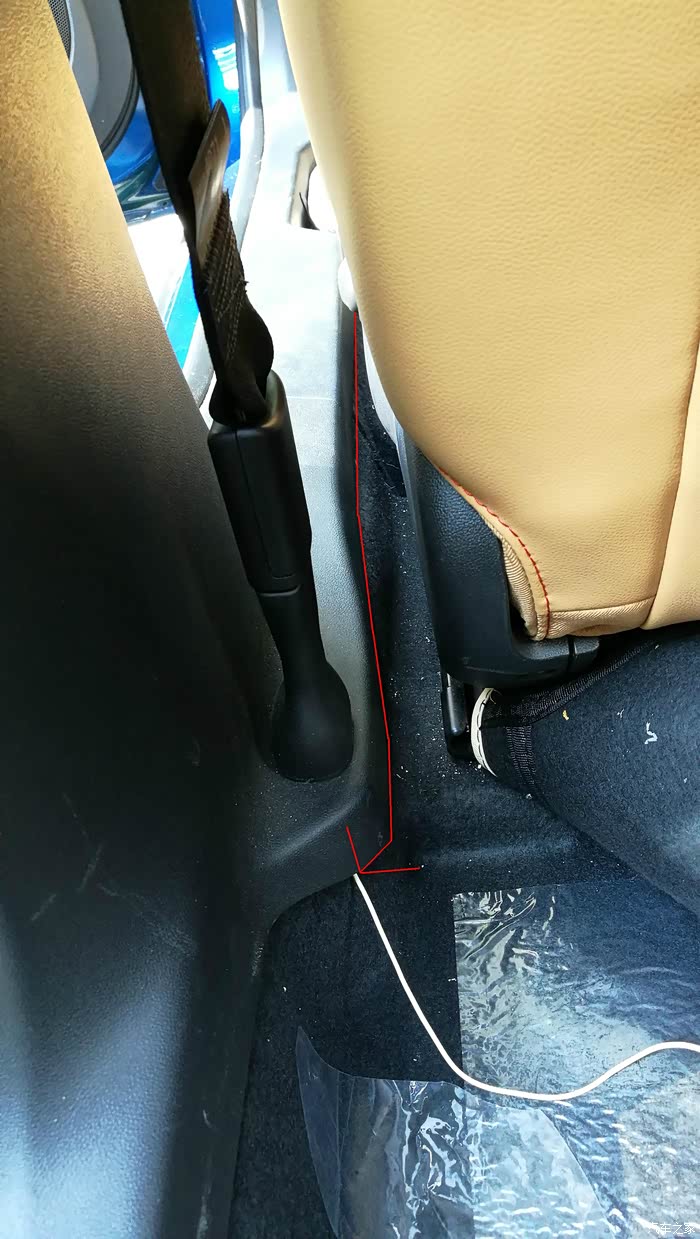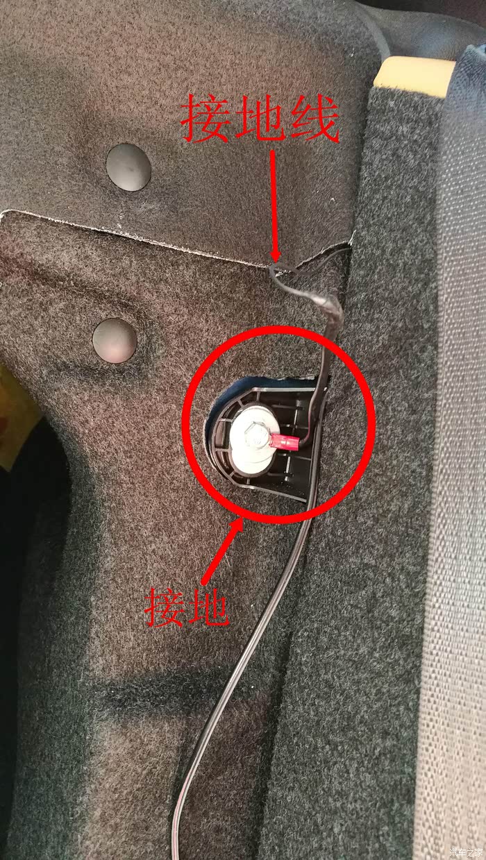 然后地线接在这里,左后排座位的后面。接上电源线上的黑线。至此,后面的线基本布好