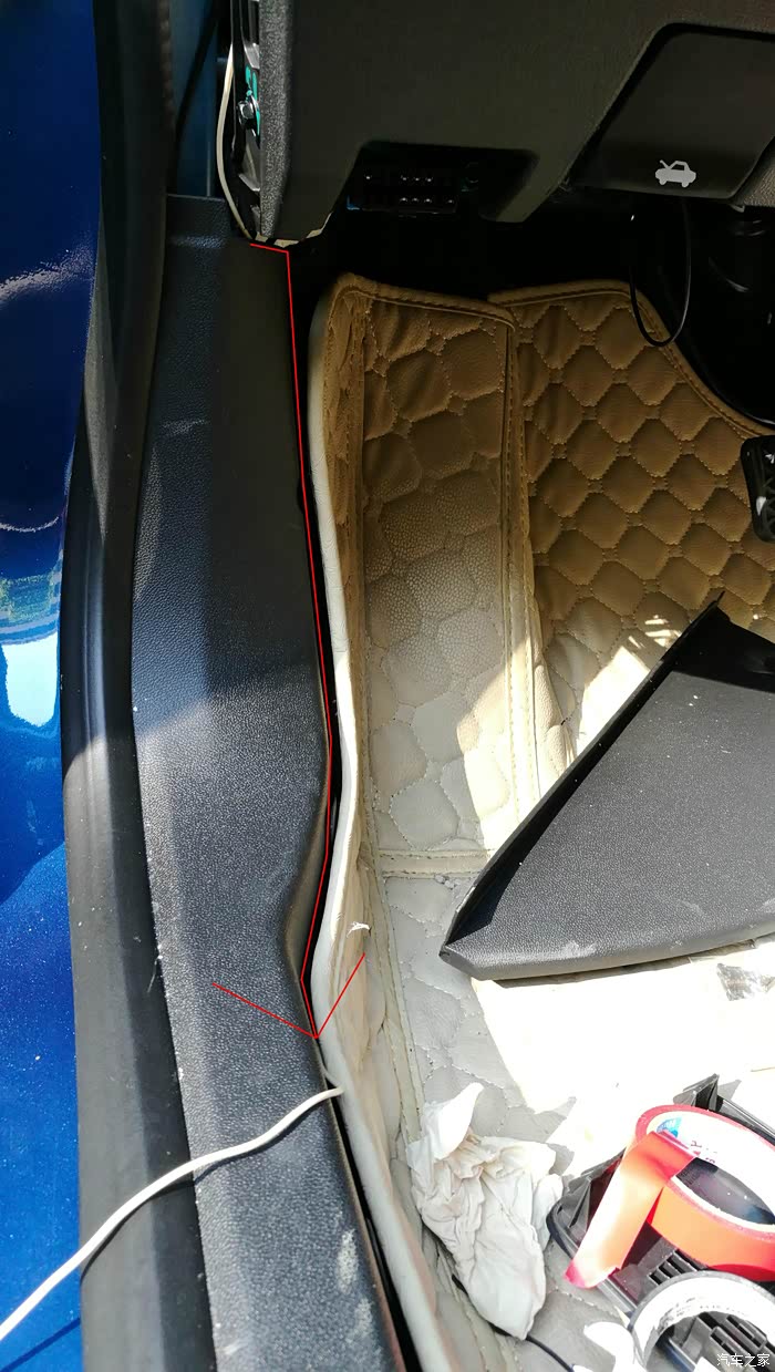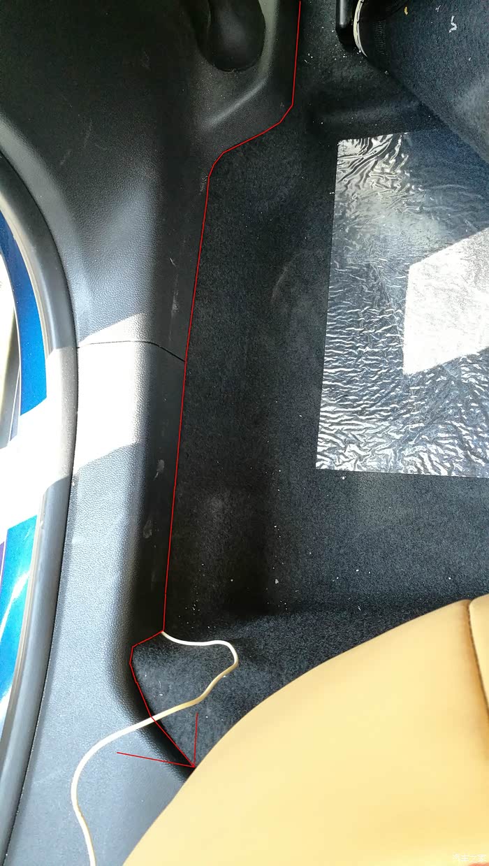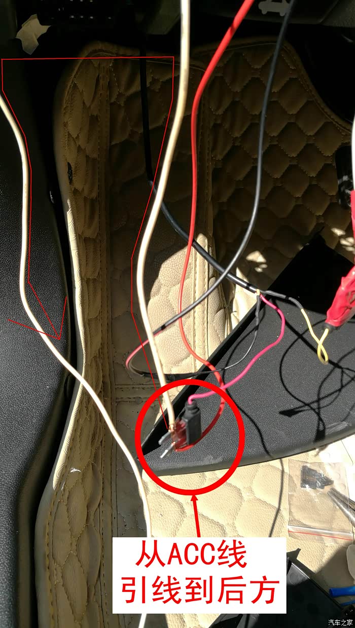 怎还没完?当然没完,电源线的正极线(ACC线)还没着落呢!从前面的ACC线上,再接一根线穿越到后面,我是没有红线了,只好用根白线代替。这里的走线,只是示意哦,接的正极线(ACC线)要从仪表台侧面穿过来哦
