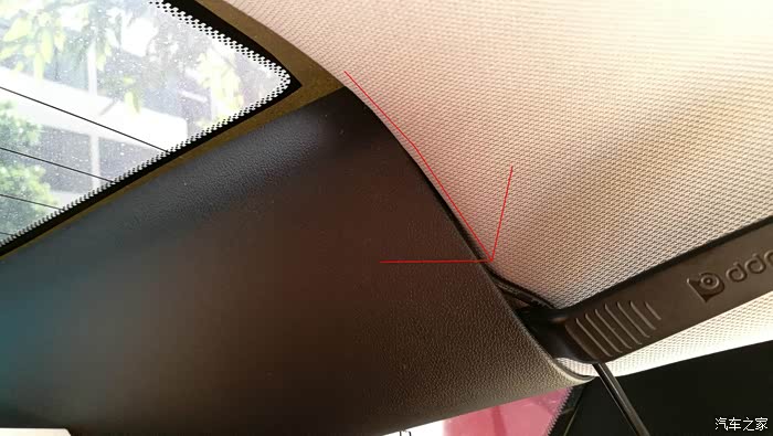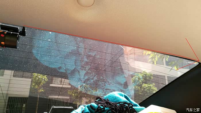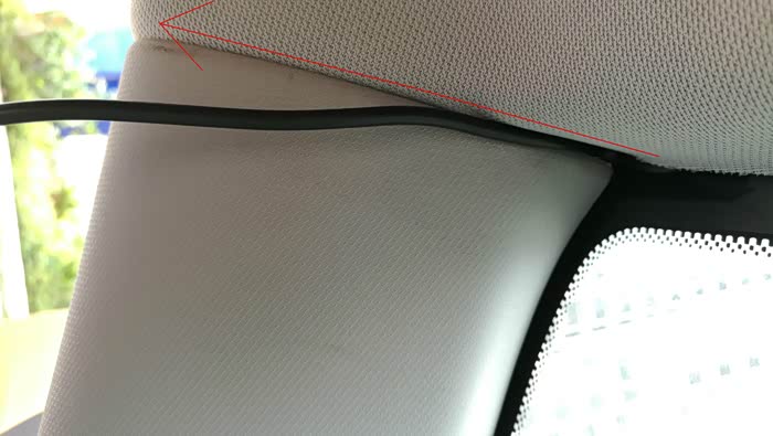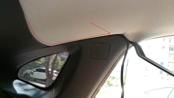 在后档玻璃上粘好后视行车记录仪后,插上电源线,开始布线,走线如图