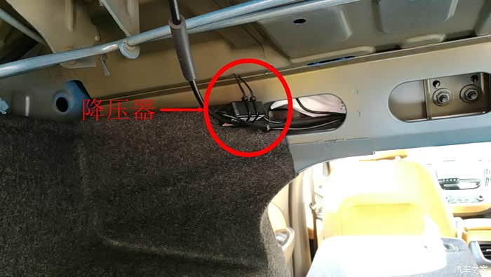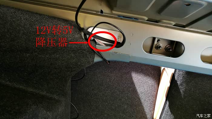 思虑再三,决定把降压器固定在左侧的拉线上(左后排座椅的放倒拉索)。这角度是我躺在行李箱仰面拍的