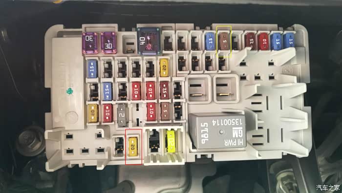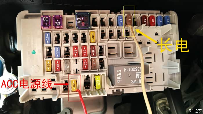 撬开以后,保险盒豁然眼前。我标的黄色框,是长电保险丝,红色框是ACC(点烟器)保险丝,我用万用电表测试过,没错,就是它俩了!