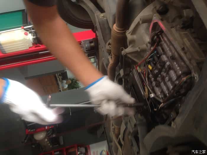 清洗油底壳后安装新的自动变速箱滤芯,更换完成后装好油底壳连接循环机进行更换自动变速箱油,循环机换油过程中需启动车辆。此时新油被注入自动变速箱内,旧油则被压力顶出来。