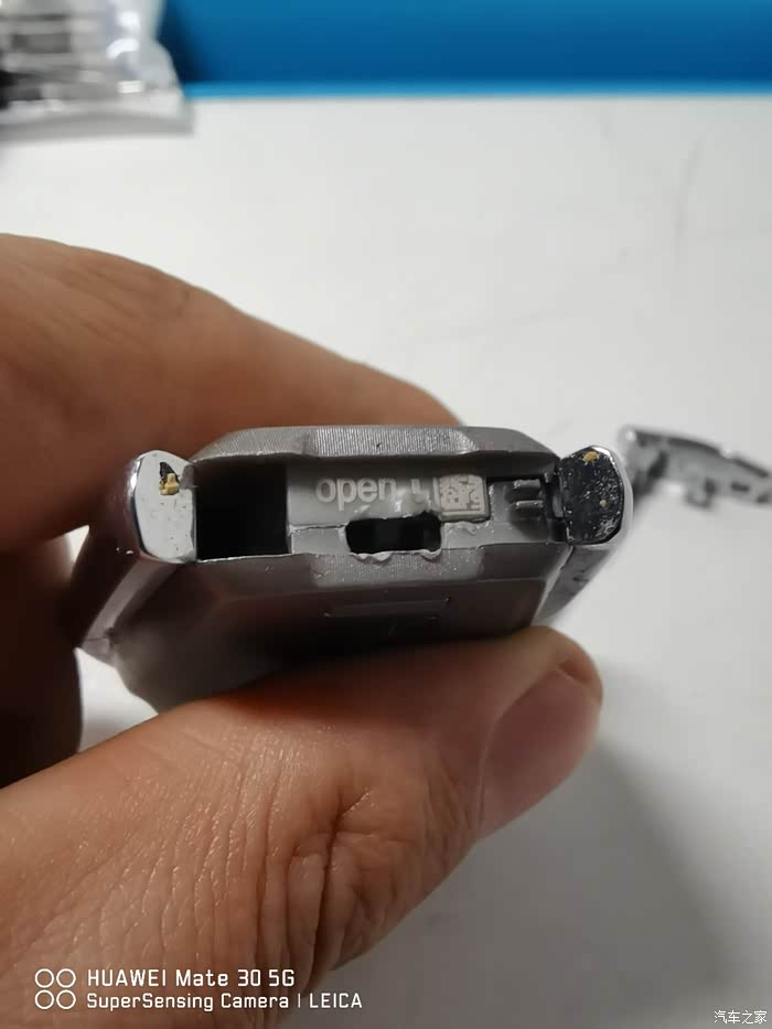 2.机械钥匙取出后,看到一个open字样,旁边有个箭头指的方向,这个方形孔可以打开钥匙。