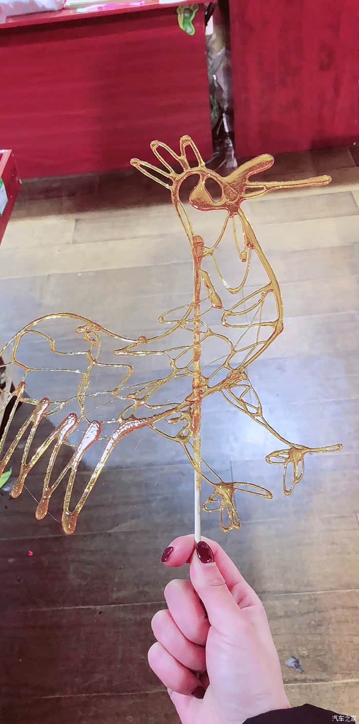 这个可是中国传统手工技艺。画糖人,顾名思义是以糖为材料来进行造型的,所用的工具仅一勺一铲,而糖料一般是红、白糖加上少许饴糖放在炉子上用文火熬制,熬到可以牵丝时即可以用来浇铸造型了。