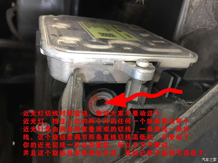 近光灯切线对焦旋钮,奉劝大家不要动这个。千万不要动。并且这个旋钮很容易滑丝失灵,我的已经不能调节高低了。