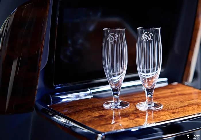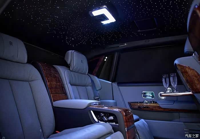 新车座椅采用鸽子灰真皮内饰,并辅以海军蓝撞色滚边,真皮座椅与相思木的材质撞击,营造了奢华氛围。车顶则采用手工打造的Bespoke高级定制星光顶,以海军蓝真皮上的1420盏光纤灯璀进行点缀。此外,头枕上的劳斯莱斯“双R”标志与外观涂装颜色相呼应,后排扶手背处配装冰箱,并配有一对刻有客户首字母缩写的水晶香槟酒杯与酒瓶。