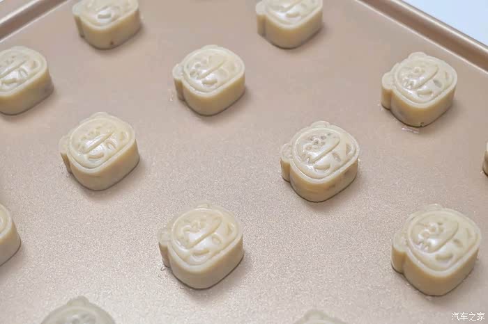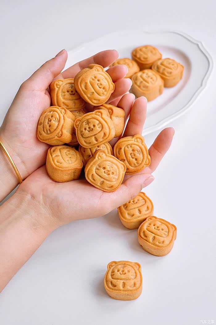 烤箱180度定型5分钟,取出晾凉10分钟左右,再次喷水雾,最后160度烤6分钟,后面几分钟要注意观察上色是否满意,再根据自己的喜好,看要不要调高温度上色~月饼馅都是熟的,皮很快就烤熟啦,皮上色满意就可以了 捧一捧小老虎送给你呀,你可以一口吃几个小老虎?