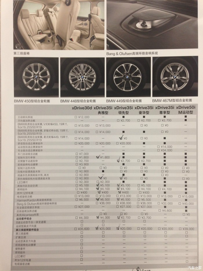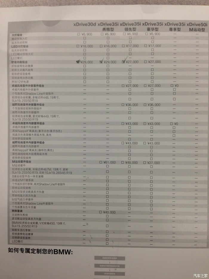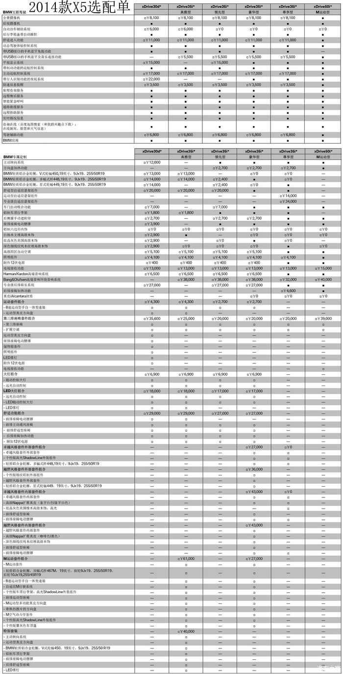 先来看下2014款X5的选配清单与2015款X5清单的区别,部分配置做了细微的调整。目前可以从宝马官网下载到2014款X5的配置清单,但是2015款X5配置单并没有上传,我只能通过4S店的彩页拍照上传以供参考。