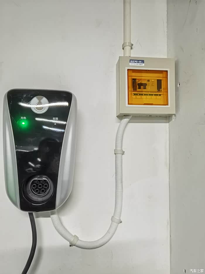 车子开回单位有个车棚,从保安室里面往外墙上拉了2.5平方的线(厂里拉线剩余的利用起来,专门有地线连接),反正只能上3kw,足够了。就是只能单个车充,将来要是同事也买新能源车,那就得轮流充了。