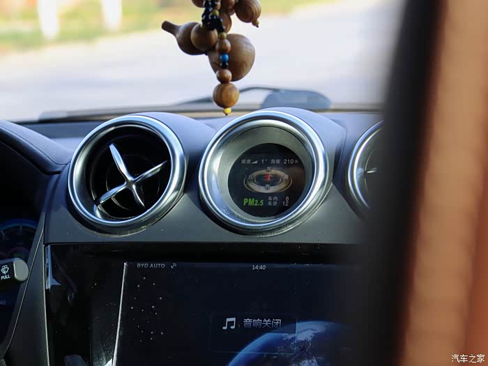 金属质感的空调出风口看起来很高级,仪表台中央两个出风口中间还夹了一个小液晶屏,能显示方向、温度、空气质量等基础信息。