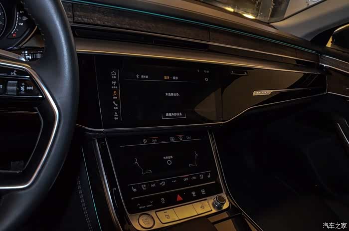 图:如果说奥迪A8L的外观是给人视觉上的冲击的话,那么其内饰绝对是感官上的享受。很显然,奥迪A8L的内饰设计绝对是少帅企业家最喜欢的风格,中控台双触摸屏设计以及贯穿整个仪表台和饰板的氛围灯,时刻不在宣示着自身的与众不同。