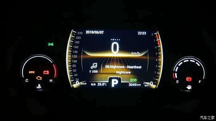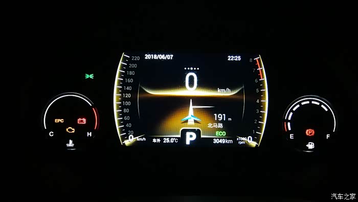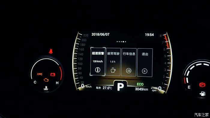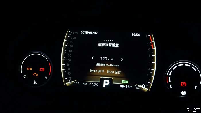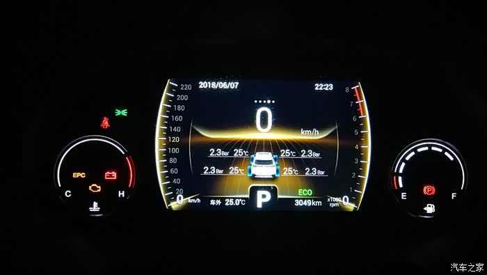 仪表是一块7寸液晶屏,正常的功能显示跟大部分车一样,转速,车速,水温,油量,车外温度,总公里数,主要说一下除正常功能显示意外的。大家看下图,车数字车速显示上方有5个小点。分别是5个页面,第一页显示的分别是续航里程,平均油耗,瞬时油耗,里程小计。第二页,显示多媒体信息,或者电话信息。第三页,显示导航信息。第四页,显示车辆位置状态和车道偏离预警,第五页,显示胎压。当然还有,比如车门开启提示,后备箱开启提示等等,这些都是很直观的。