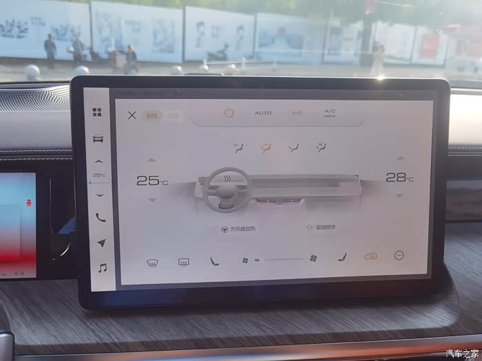 中控大屏下方的物理按键分别代表风度,风量大小和风的吹向等等。不过要注意的是想要凉风必须要点开“AC”空气压缩机制冷按钮,冬天天冷想要暖风必须关闭“AC”按钮,这样才会达到最佳的温度效果。