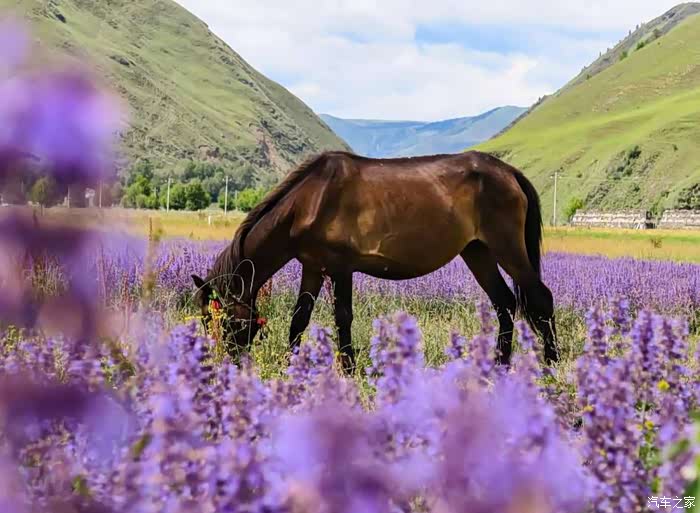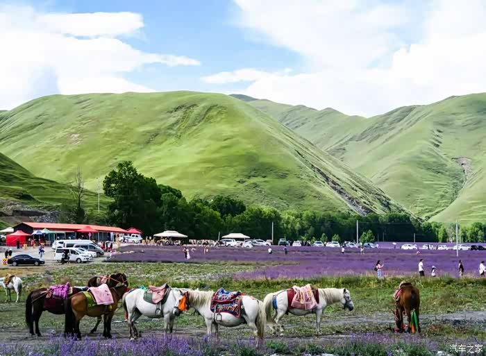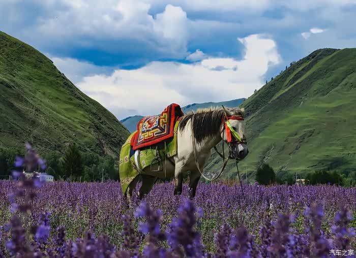 蓝天、白云、青山、白马、薰衣草构成多彩的油画。