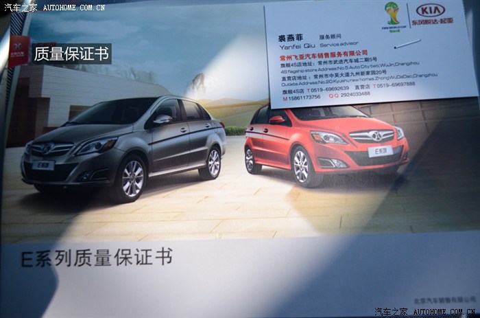 买北汽E系列完全是偶然,之前对这个车没有半点了解,纯粹是脑子发热,1月10号的时候跟我爸在我们县城里瞎逛,去看了cs35、致尚但是都没有现车,到下午3点多的时候准备回家了,路过一家买汽车的看到里面有一辆cs35,遂去打听,突然发现大厅放了一辆奔驰,就去转了一下,呀,发现后面写着北京汽车,一问价格,我都惊呆了,而且在展厅看起来外观也非常好看,就直接付了定金,3-5天后提车,然后就平静的回家了,到了第四天,经销商打来电话,就去提车了,然后当天给临牌保险弄下来也就下午4点多了,直接开回家,过了一个礼拜后上牌!从此就开始了有车生活!