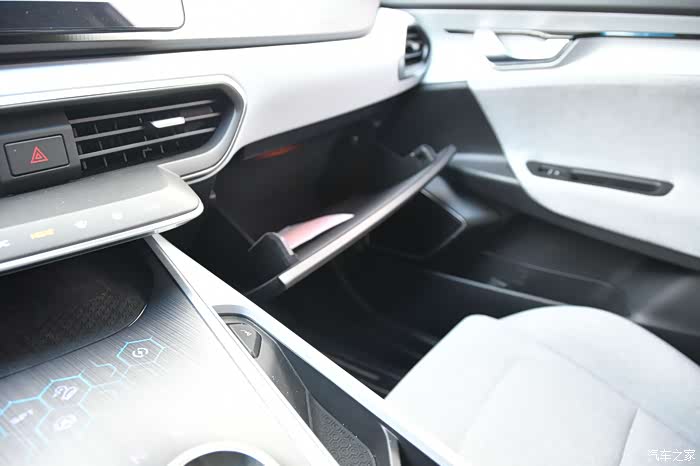 都说细节决定成败,在几何A上同样让我发现了比较有意思的细节设计,副驾驶的手套箱采用的是按键式设计,按键集成在了扶手箱的右上方
