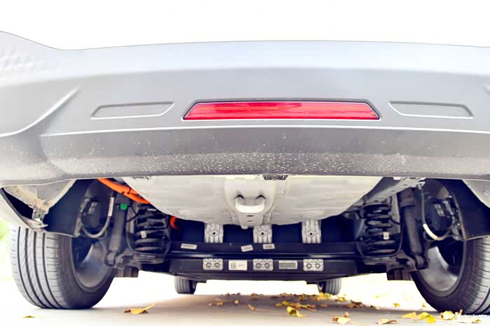 从车头看几何A的底盘还是比较平整的,原厂自带的护板能够对电池组和电机起到很好的保护作用,避免高速行驶或者特殊路面对底盘造成损伤