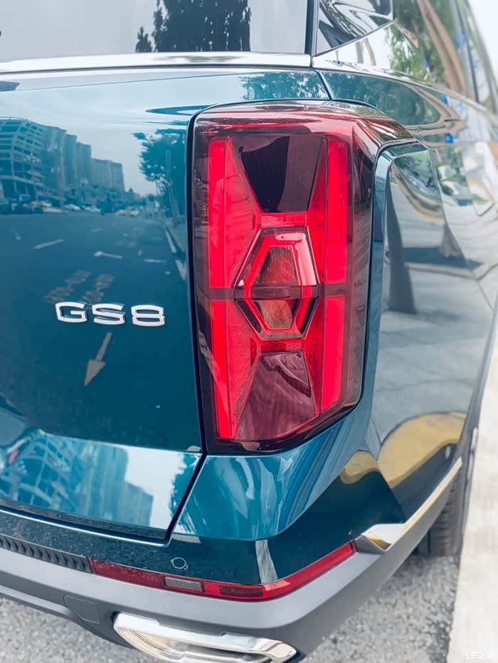 提到壮汉,一般我们会联想到粗壮,重庆话就是拽实,反正是肯定跟美沾不上边的。传祺GS8长4980mm,高1780mm,宽1950mm,侧面看上去是真的很大很高,高大威猛。但是整个曲线很顺畅,线条设计的很好,看上去还真的挺美的。配备了255/50 R20轮毂,增加了离地间隙。尾灯也是8字造型,与前大灯相呼应,很奇妙。双边单排气口设计了隐藏,不像其他车那样直接裸露出来,真的不美观,看上去不太走心。