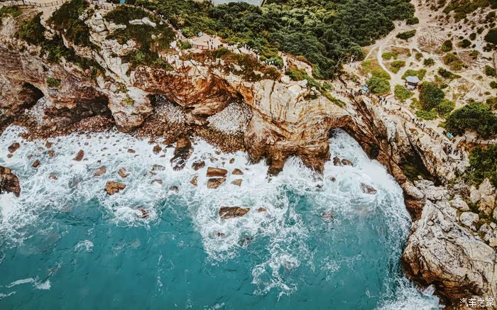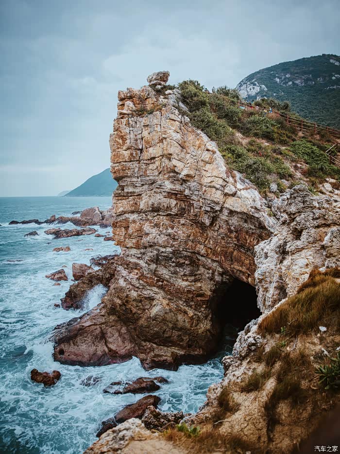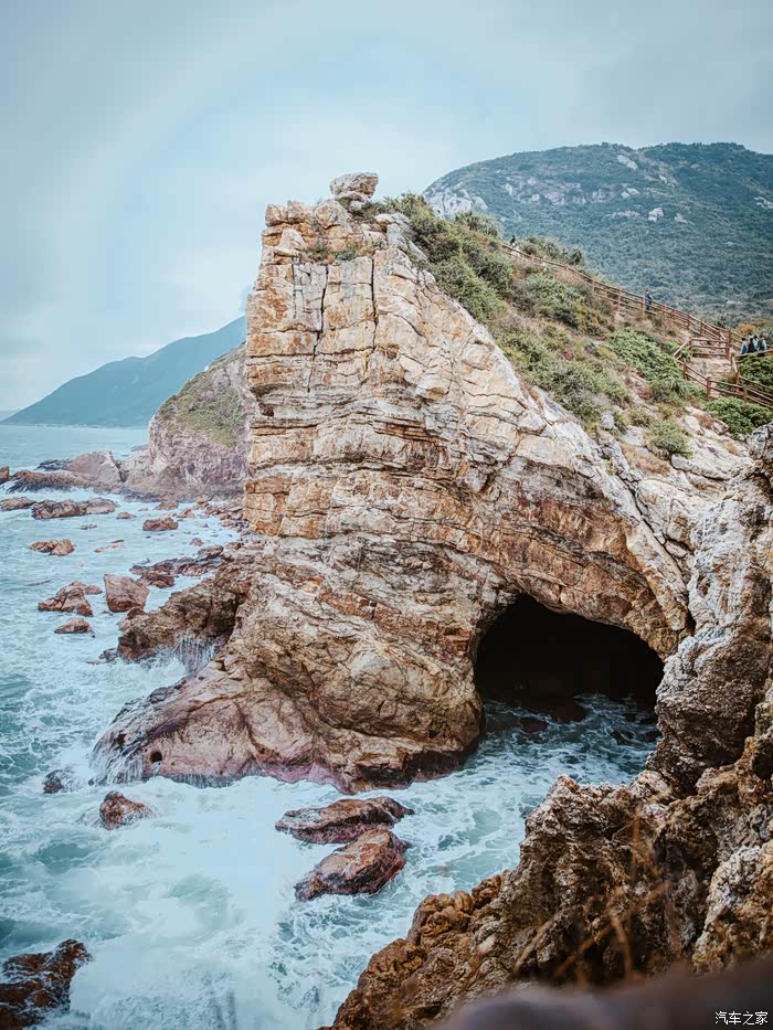 沿着木栈道往前,脚下高高的悬崖下就是大海,大海与悬崖相连的地方有一个洞,这洞就是美人鱼出入大海的洞口了,若是第一次来怕找不到也没关系,路边有很多指示牌指明了去看取景地的路线非常方便~