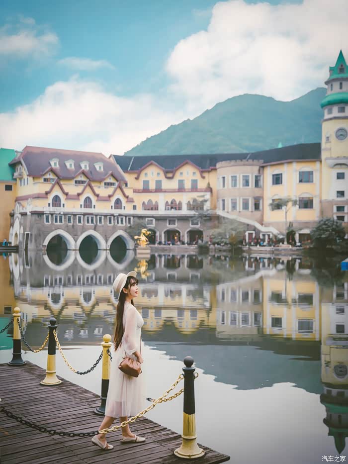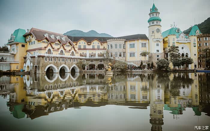 中心湖区坐落在一座青山之下,我们面朝小湖,环境清幽,空气也很清新,湖水清澈的就像一面镜子,岸上的欧式城堡和彩色小屋倒映在湖水中,水里波光粼粼,让人不得不陶醉于此。