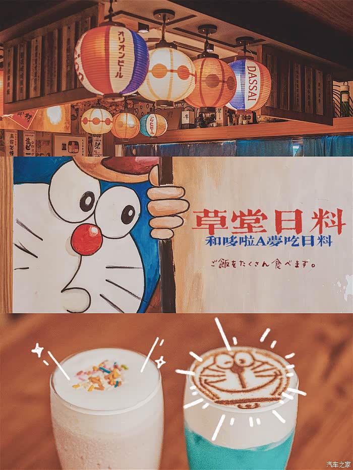 从童话虫洞出来,还可以去周边的创意草堂日料和哆啦A梦吃一顿日料~店铺里满满的日式装修风格,一楼是日系的居酒屋风格,小木屋里摆满了各种可爱的哆啦A梦,扭蛋装饰,动漫手办,仿佛来到了动漫世界,好看好玩又好吃!