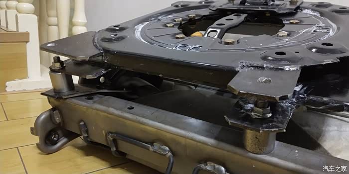 转盘第二天发到,开搞,转盘因为尺寸不够需要焊接铁板,需要注意的是座椅上面的二个焊死的螺杆需要切割掉一半,不然会影响转盘转动,后面二个用增高螺丝拧上。转盘上开孔必须上下二层的孔开的一至,