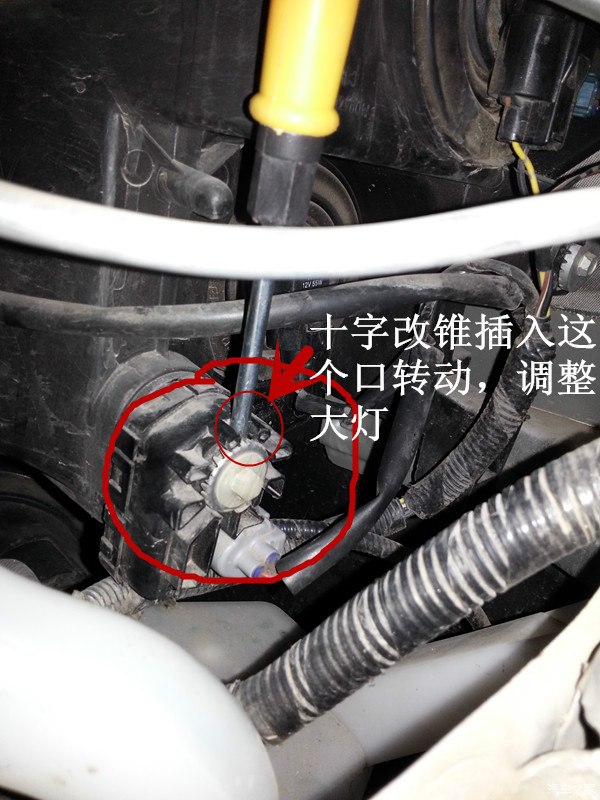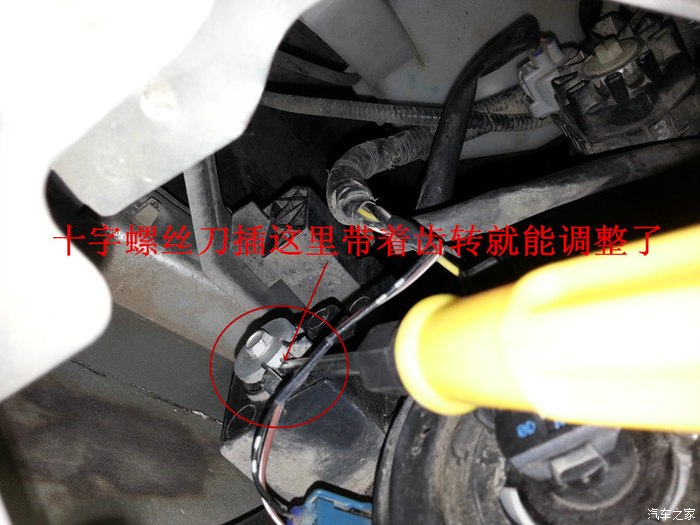 一侧的大灯有两个调整的,一个管左右,一个管上下,自己动手试下吧。