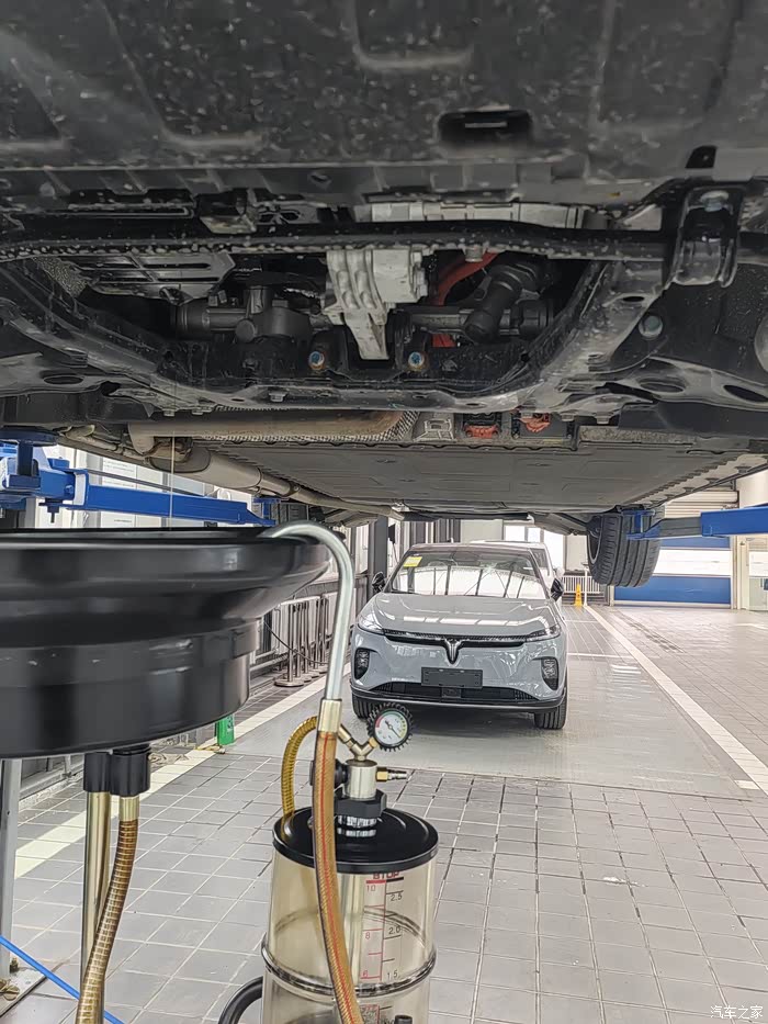 3、很快安排的技师师傅过来了,拿着工单我看了一下就是换机油机滤还有常规检查。师傅打开机盖,里面的各个部件和新的一模一样,跑了4800公里发动机里程也就一千公里的样子。增程发动机只是发电不驱动应该不用像油车那样磨合发动机。车子被举升机升起的那一刻,第一次见到了008的底盘。那么的平整、那么的整洁。给人很踏实的感觉。