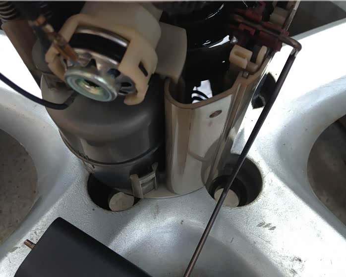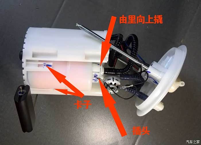 2.汽油滤芯装在燃油泵总成上,拆卸燃油泵步骤