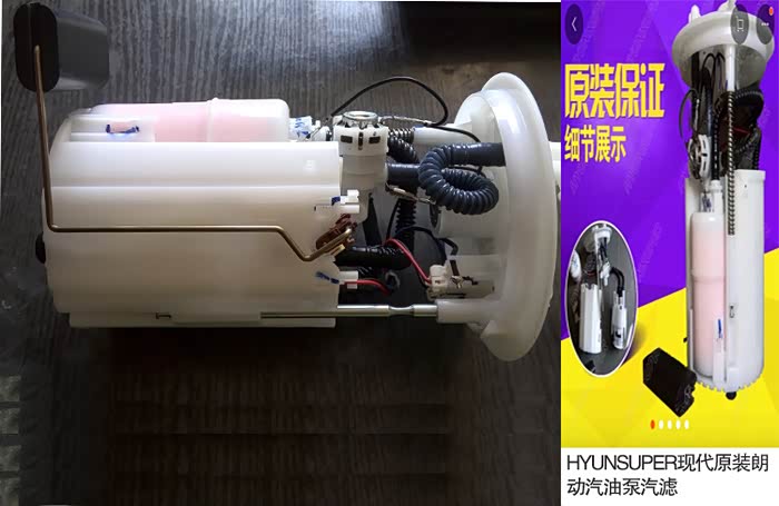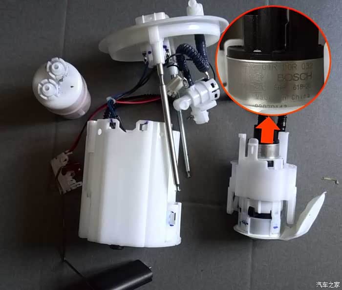 分解开的原装总成,可以看出汽油泵电机是博世(BOSCH)的,各方便做工精细,电机非专业人士不建议自己动手更换,安装不好,会经常反复。