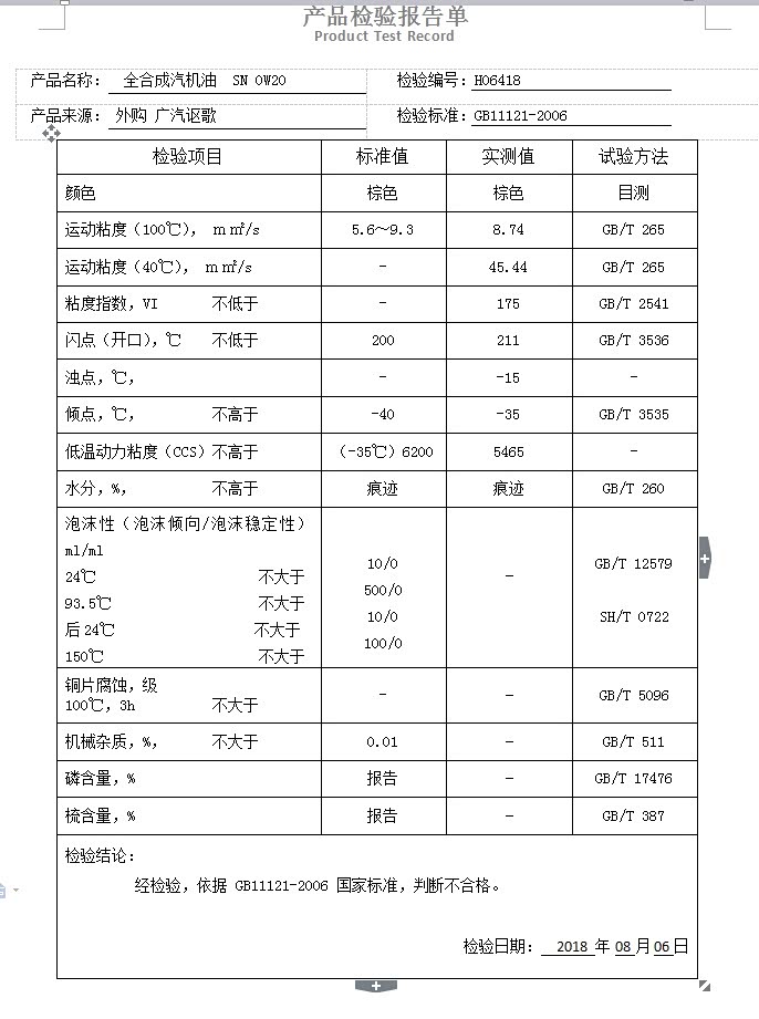 6.倾点-35,不合格。出乎意料啊,作为原厂油竟然也不合格。倾点是指油品在规定的试验条件下,被冷却的试样能够流动的最低温度,倾点的物理意义是反映油品低温流动性的好坏的参数之一,倾点越低,油品的低温流动性越好。