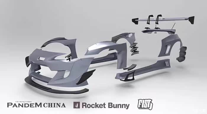 Pandem V3,从这一代开始Rocketbunny产品正式改名为其销售公司品牌名称:Pandem。这套宽体套件拥有了比前2代产品更多的部件数量,并且风格发生较大转变,更加偏向于竞技风格。也是目前全球最火的86/FRS,BRZ宽体套件。整套套件包含:头唇,侧裙,尾唇,前保险杠,加宽前叶子板,加宽后叶子板,鸭尾,GT尾翼,前风刀,侧裙风刀,尾部风刀。配件为尾部扩散器上配套的后倒车灯,尾翼拉杆4根。