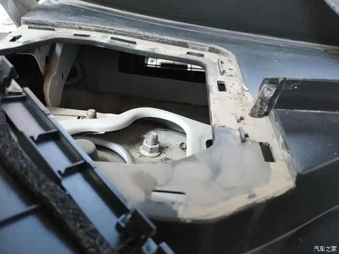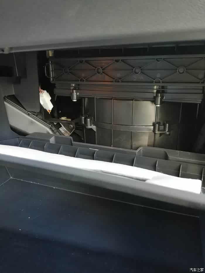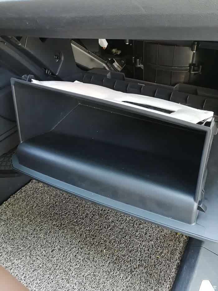 拆卸手套箱的第二步,网上有说把手套箱下面两个螺丝卸掉,然后拿掉下面的塑料盖板,再拔掉手套箱下面门轴的两个销子把手套箱拆卸下来,我没有用这个方法,太麻烦,需要拆卸的太多。我直接用了大力出奇迹的方法,直接用力别出来,别出来后发现,其实其实设计的时候两个限位器就是个斜面,就是为了别出来的,而且也没有用什么力气就出来了,至此手套箱拆卸完成。