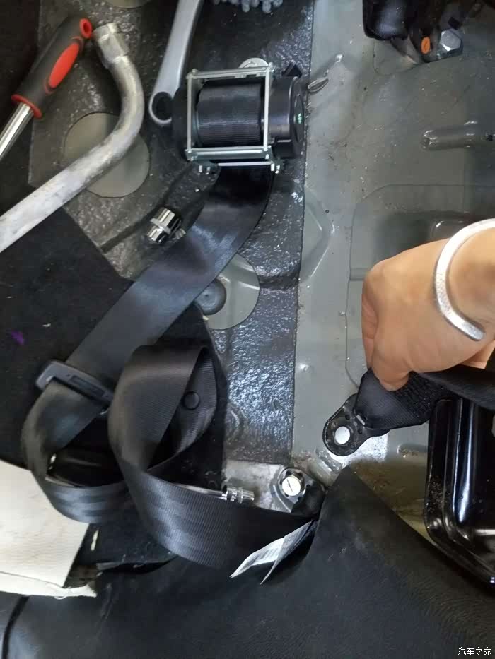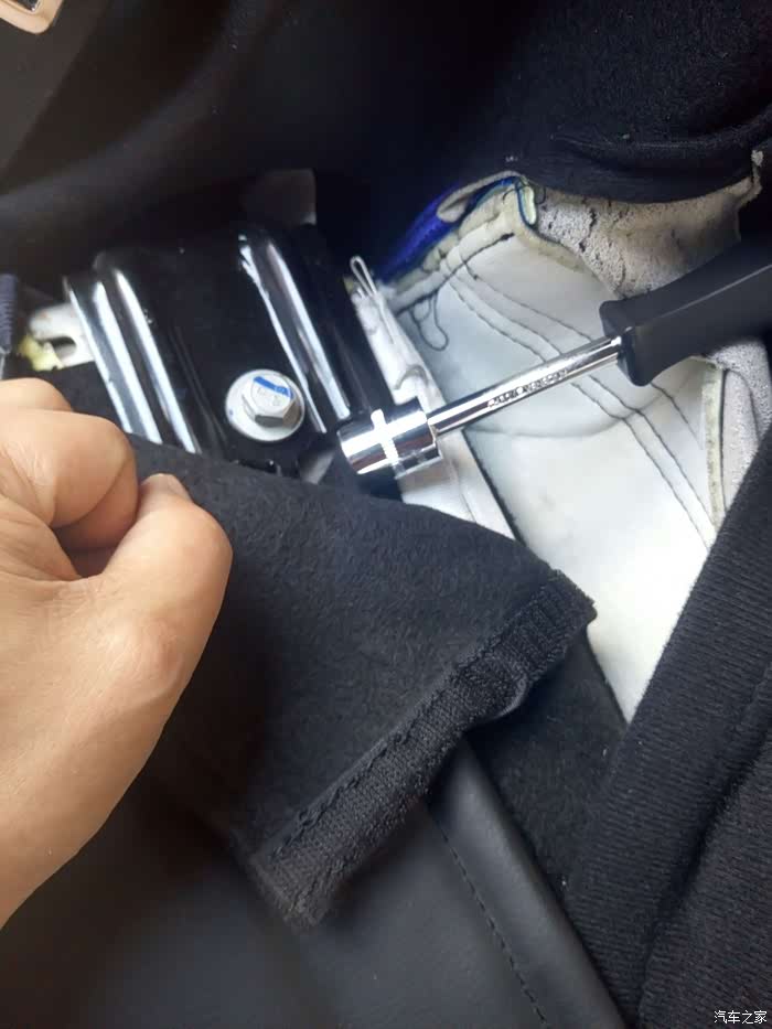 3、拆完坐垫拿走,就能看见安全带的下面螺丝了,这个是17号套筒,用套筒拆装更稳!