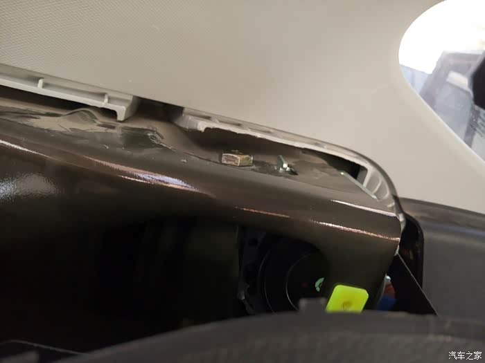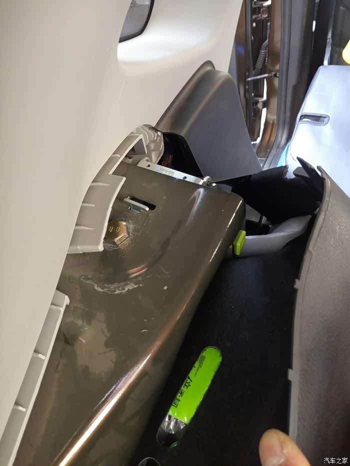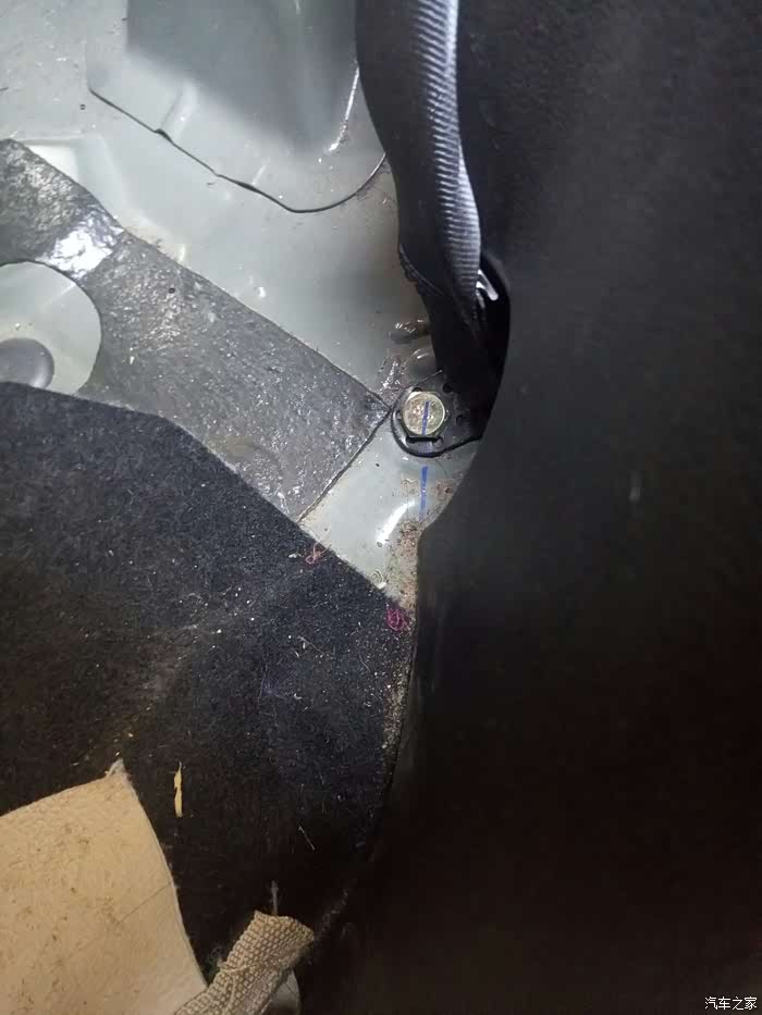 4、接着拆上面固定安全带的螺丝,坐进后备箱才好下螺丝,后面有两颗螺丝先拆了,再拆开点装饰,就可以看到固定安全带的17号扳手拆的固定螺丝了,螺丝拆到最后被塑料抵住,用螺丝刀或者什么撬起来点,就可以把螺丝拆出来了,现在旧的整条安全带拆除!换上新的,然后还是17号扳手??上紧螺丝!然后先试下,免得麻烦,正常了就可以把装饰回位,上螺丝,这里要注意把安全带放进孔里…我一激动没注意,装饰板螺丝都上了才发现没放进去!