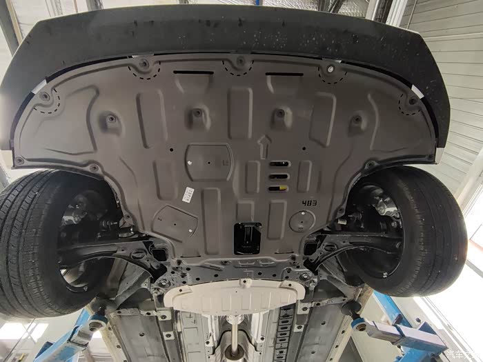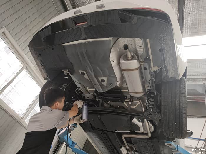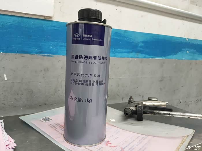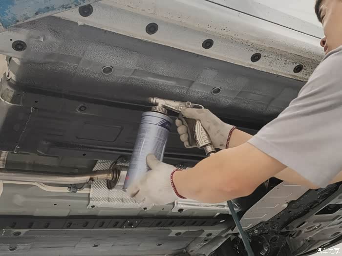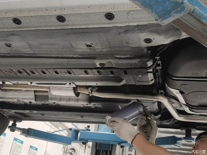 原来这就是底盘装甲,跟喷漆似的。维修师傅解释道底盘装甲就是在底盘容易腐蚀的地方喷上特定的防护胶,这样可以有效防护路面砂石对底盘的击打,防止轻微的拖底磨擦;同时也能起到防腐蚀、降噪和隔热的功能。
