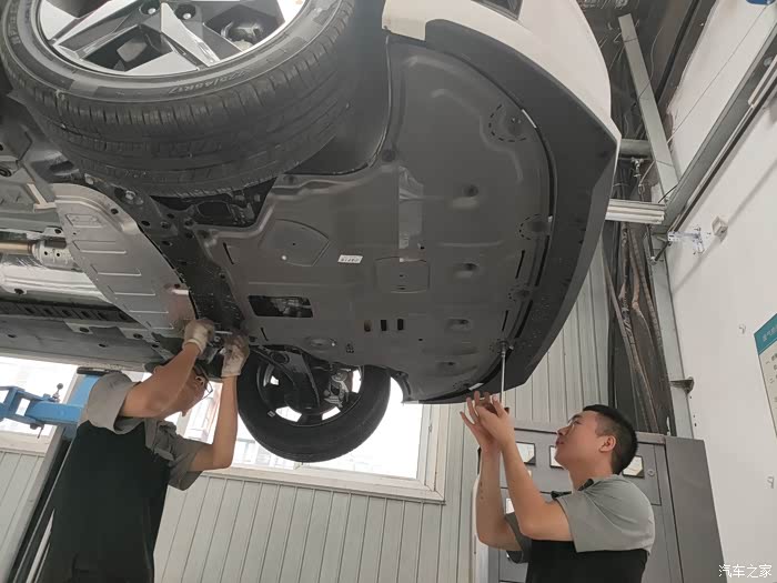 第一次看到车的底盘,原来是这种构造的,师傅把原车的护板拆下来,换上了一个金属的护板,两个师傅施工还是挺麻利的。