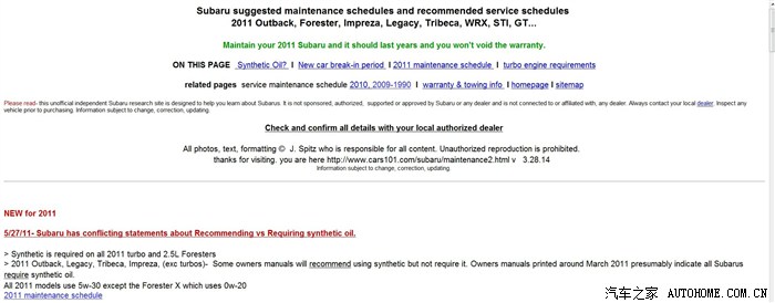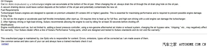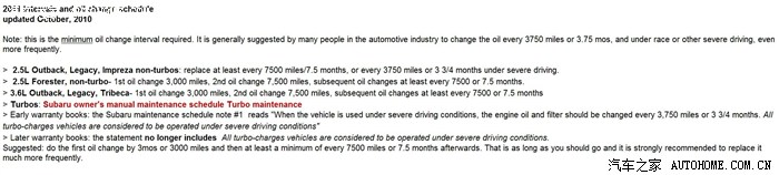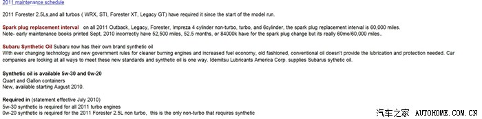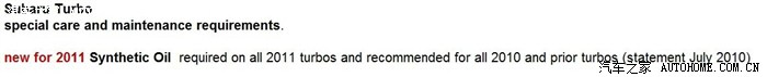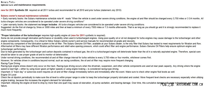 原文中专门针对涡轮增压车型提出了要求:2011年以后涡轮增压车型就必须使用全合成机油,这也和美国斯巴鲁4S店给我的答复完全一致了~