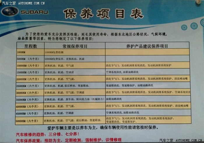 说到机油的问题,不得不提下斯巴鲁厂商规定的保养。我们同样对中国和美国的森林人车型进行前后对比: