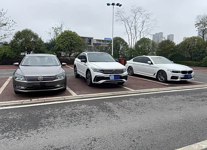 像不夸张的来说,这辆车和任何车型放在一起对比的时候,其实其实是完全不熟的,比如说最左边是老款的迈腾,中间就是我的途观x,最右边呢就是宝马5,如果单论运动感和时尚感的话,绝对是途观x最强一些,它是一辆SUV,所以气势是这三款车里面最有气质的,像一只色的宝马,除了标之外,其实整个车子的设计绝对没有途观x好看。