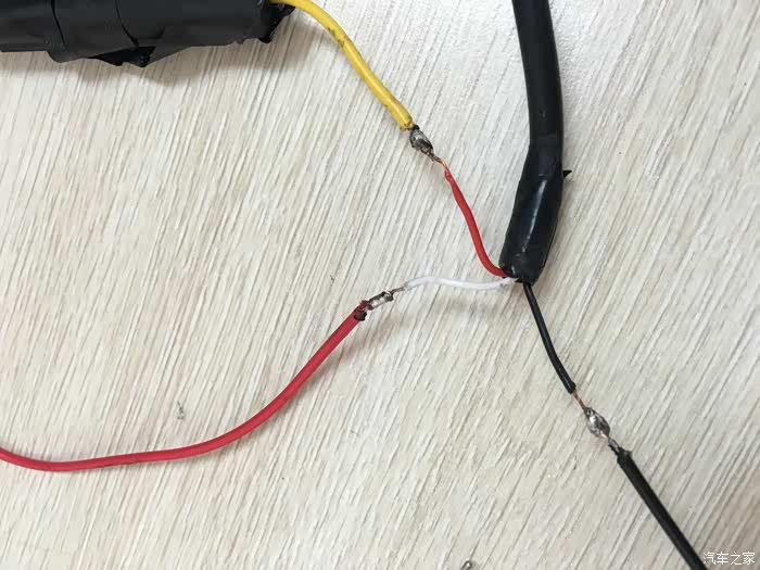 剪断的都得重新焊上,原厂的接线有四根,有一根视频接口线被我咔嚓了,留下三根有用的,黑色的是地线,黄色的是ACC,红色的是常电。
