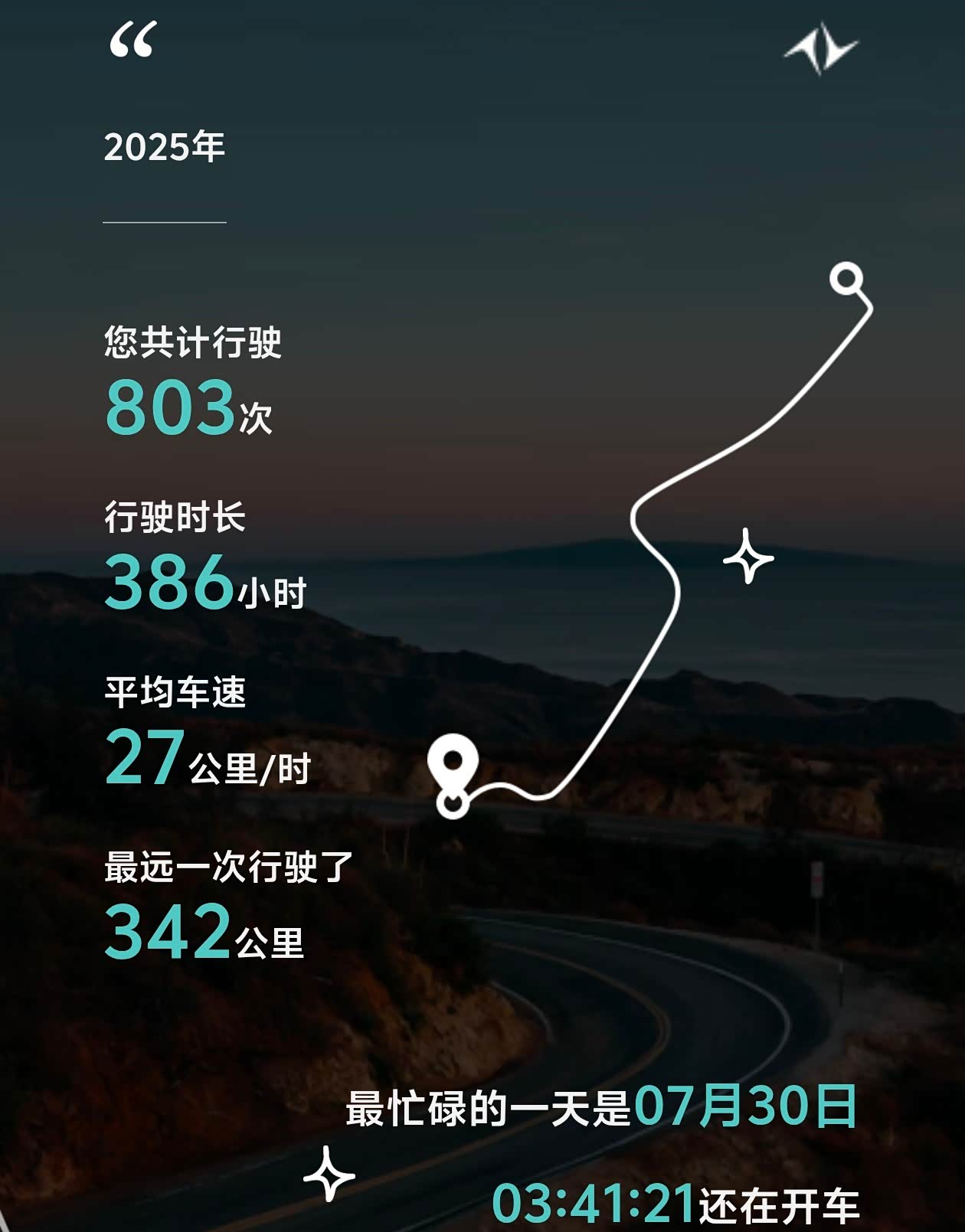 2025年的行驶里程只有10419公里,对一辆增程车来说跑的并不多,主要是日常不需要开车通勤,25年家里事情也比较多,没有太多机会外出游玩,这一万公里的行程,基本是一半高速,一半市区,体验可以说是各有不同。