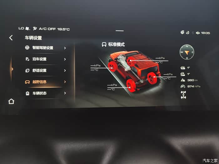 最亮眼的是坦克300有一个越野信息的显示(我没装胎压传感器),可以直观的看到指南针 海拔 倾角等信息