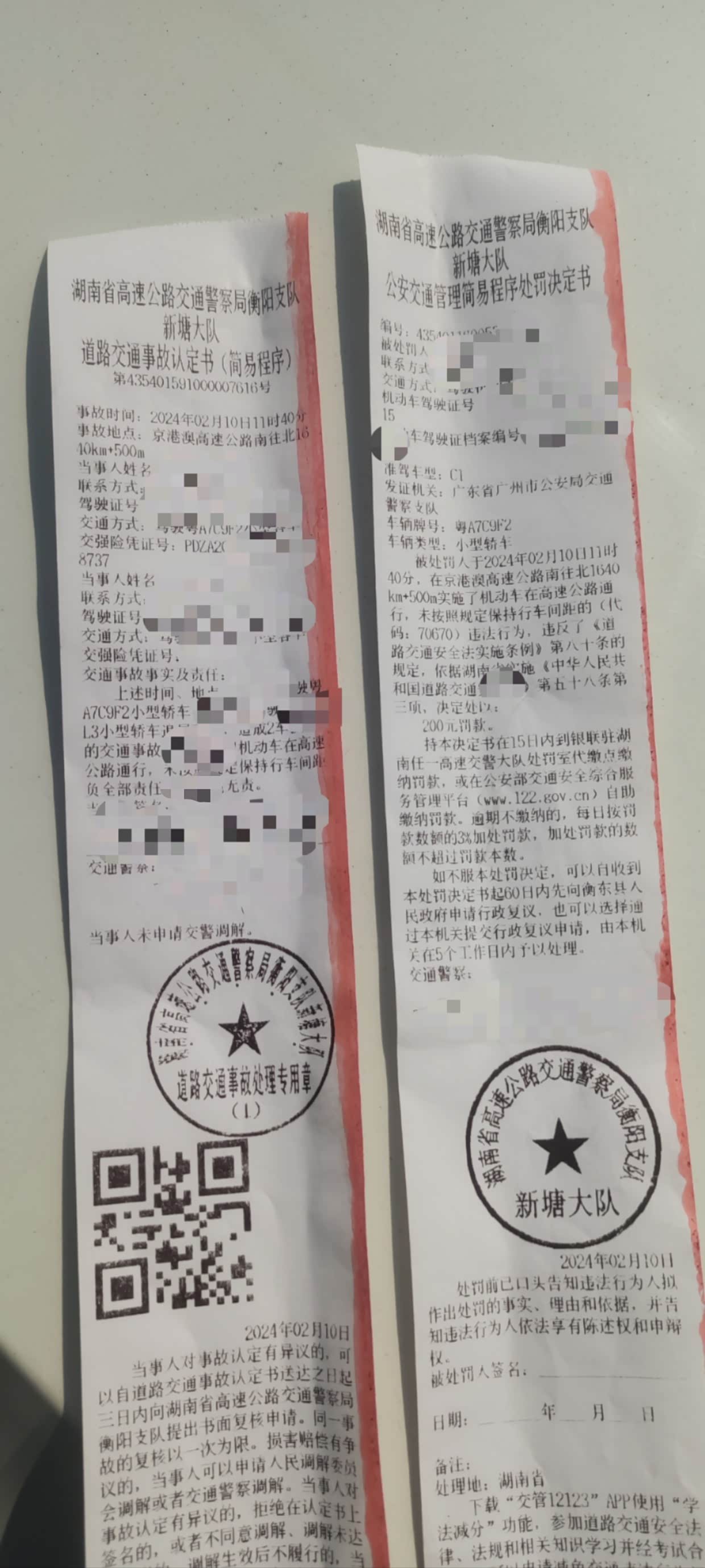 保险说是需要先报案定责,于是拨打了122,当地工作人员说需要在前方出口下高速去等待,于是就加了前车的联系方式,然后一起去了前方出口等待。年初一,工作人员也是很忙,大概等了半个多小时,交警就赶到了。然后察看了一下双方车辆,询问了一下事故原因就问是私了还是报保险,前车车主说电话咨询了一下4S店需要2000块左右,我一听肯定就只能出保险了,如果500以内还可以考虑一下自己付了算了,反正自己也要修车就走保险吧。交警说是我的全责,我认了,大年初一也不想和谁去争论了,虽然前车停在高速超车道内,也不知道什么原因,前面还有一辆车刹停了在那里,所以他也停在了那里,但毕竟是我安全距离没有留够导致的追尾。还罚款了200元。警察开具完责任认定,双方签字确认后就走了。剩下的就是保险的事情了,保险员也不到现场,只是让加了微信然后发了责任认定书,车辆照片,车架号,行驶证驾驶证这些文件过去就可以了,因为双方都不是当地的,只是在此处发生事故,所以保险员说后面到修车时联系当地保险就可以了。
