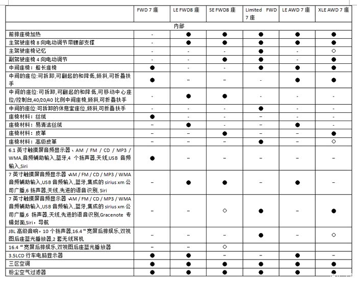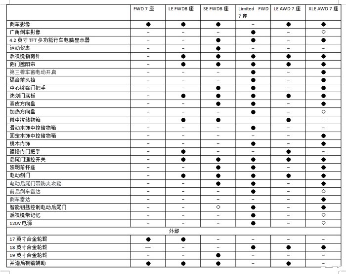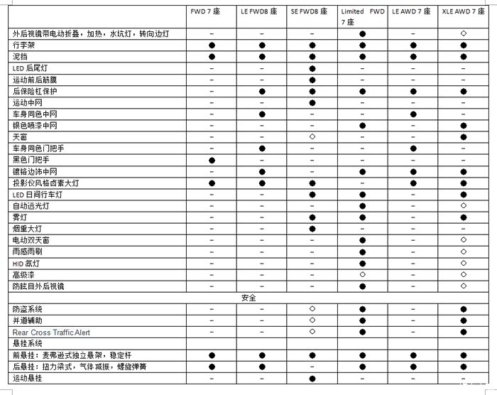 简单解释一下选配的意思。SE的选配是科技包里的所有配置,加拿大版SE有两种配置,一种是标配SE,另一种是SE选配科技包的。XLE里的选配是Limited包里的配置。其实加版车Limited版本是在XLE基础上选配Limited包。简单点说就是这个空心圈的配置就是XLE和Limited的差别。