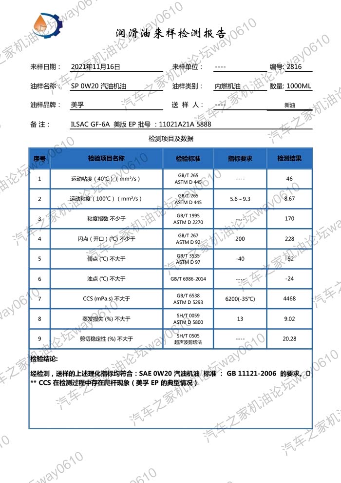 检测只对样品负责,样品由论坛车友“论坛家兵”提供,1QT装未开封新油,某东国际自营直接邮寄到实验室。
