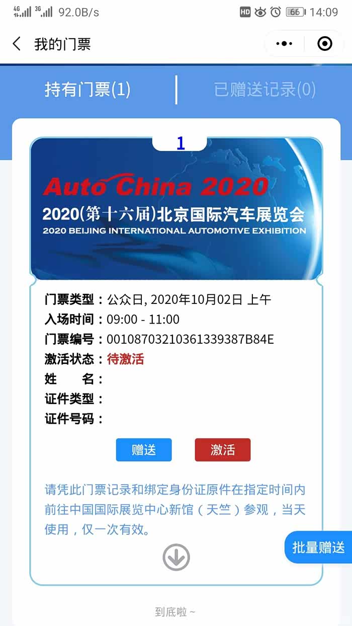 感谢车展方的努力,这次车展用的是非实体的电子门票,只要微信发送,激活,到门口刷身份证就可以了,减少了不必要的快递成本和传播疾病的可能~也更该感谢发送门票的朋友的努力争取